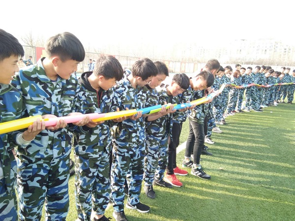 第二个项目,是有轨电车,各个班级自行组队,共四队,每队二十名同学的两只脚腕各绑在同一条绳子上,前后搭肩行进,最先到达终点后返回起点的队伍获胜。这个项目更能体现大团队的默契,大家步伐一致,才能保证平稳快速行进。各队都有自己的妙招,提前沟通安排队形,大家你一言我一语,赛场上好不热闹,各队准备好后,比赛在总裁判的哨声中开始了,参赛队伍的口号,啦啦队的呐喊,昭显着青年一代的热情、朝气和奋力拼搏的精神。