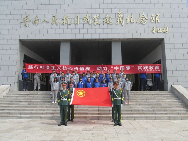 为弘扬爱国主义精神,践行社会主义核心价值观,增强学生的使命感,引导学生树立正确的,人生观、价值观、世界观,4月5日,化学工程学院团总支组织优秀团员、国旗手,开展“践行社会主义核心价值观助力‘中国梦’践行教育”活动,参观鲁南人民抗日武装起义纪念馆。