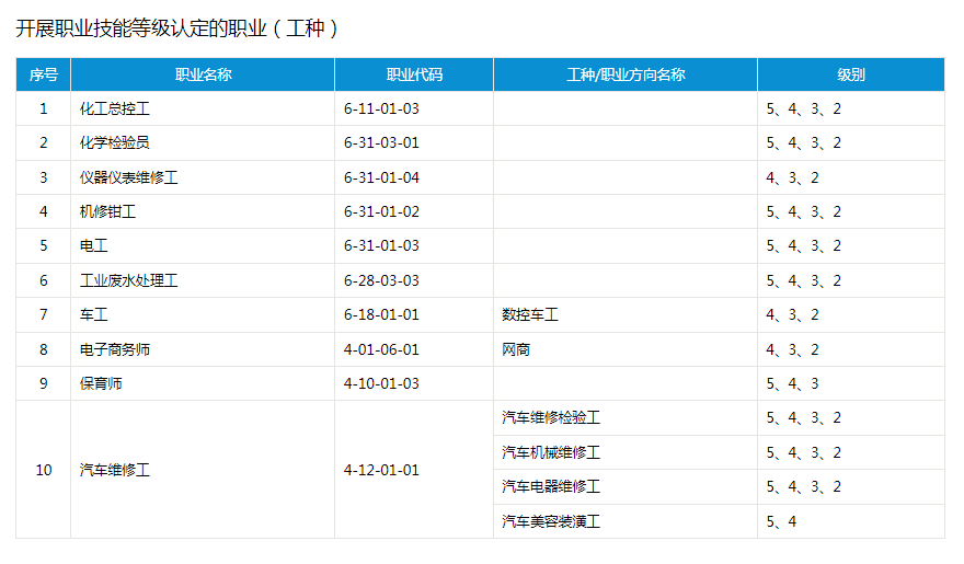 社会化职业技能等级认定工种