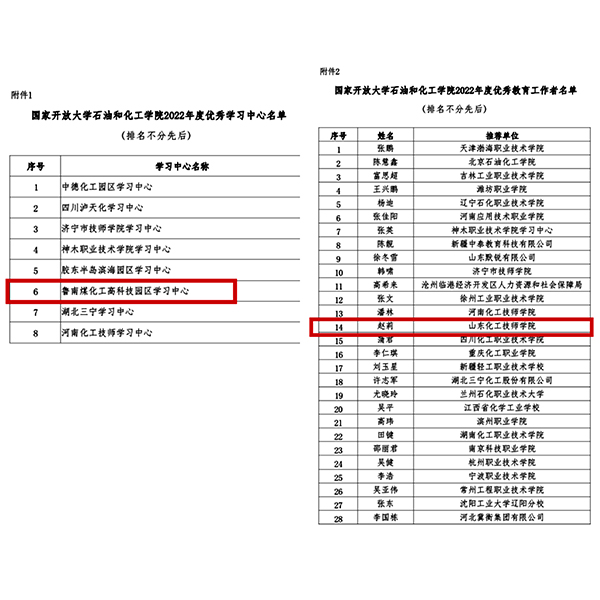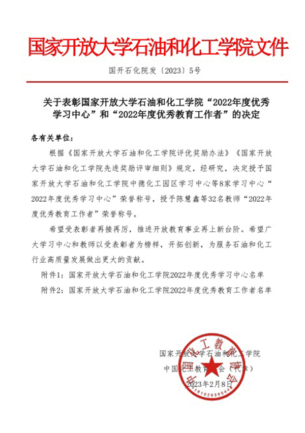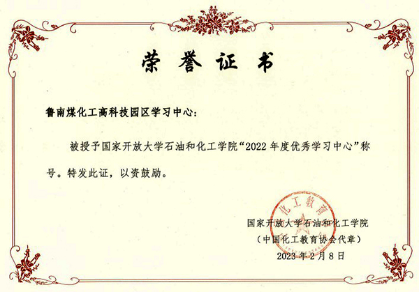 近日,国家开放大学石油和化工学院公布《关于表彰国家开放大学石油和化工学院“2022年度优秀学习中心”和“2022年度优秀教育工作者”的决定》,鲁南煤化工高科技园区学习中被授予“2022年度优秀学习中心”,我院教师赵莉获评“2022年度优秀教育工作者”称号。