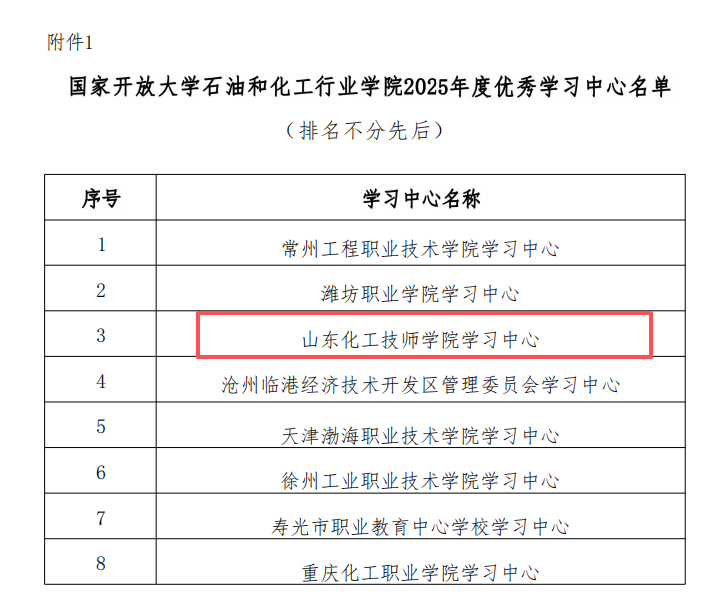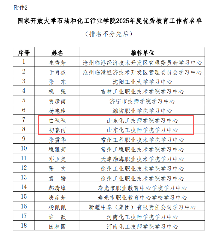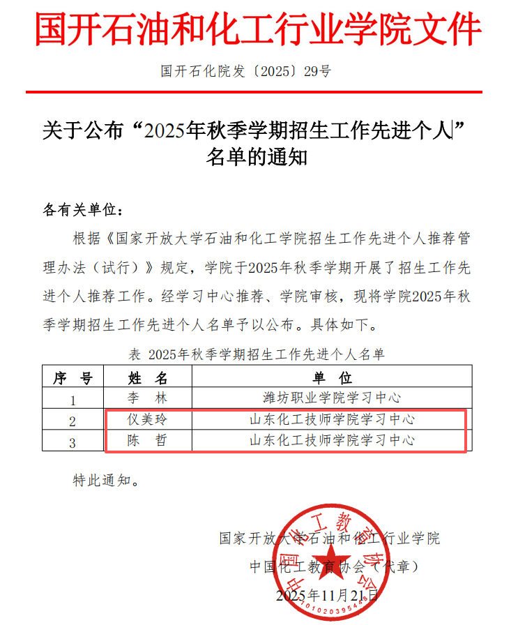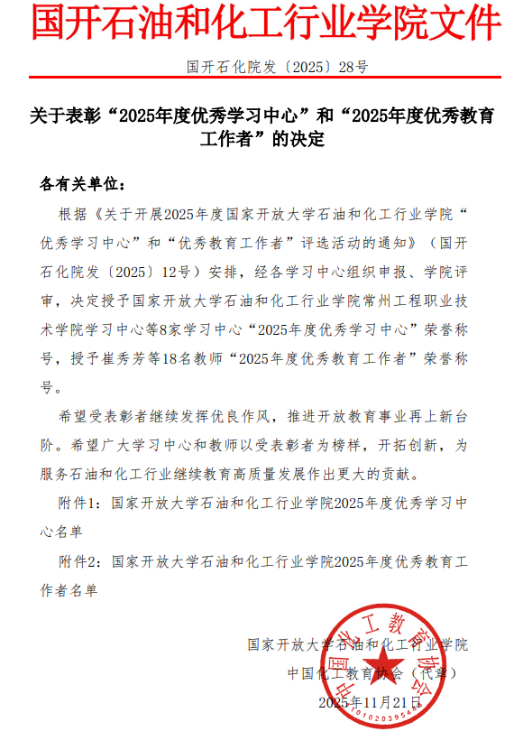 近日,国家开放大学石油和化工行业学院发布《关于表彰“2025年度优秀学习中心”和“2025年度优秀教育工作者”的决定》(国开石化院发〔2025〕28号),发布《关于公布“2025年秋季学期招生工作先进个人” 名单的通知》国开石化院发〔2025〕29号,我院获评“优秀学习中心”,教师白秋秋、初春雨获评“优秀教育工作者”,教师仪美玲、陈哲获评“招生工作先进个人”。