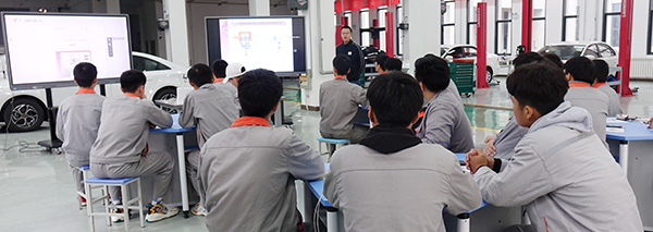汽车工程系李瑞老师讲的是《制动片的检查与更换》,通过刹车时前轮异响故障引入工作任务,学生通过资料收集,初步制定任务实施计划利用UMU进行任务计划的汇报,教师点评统一实施计划后进行任务实施。实施过程中巡回指导记录问题并拍照,通过投屏的方式讲解任务实施过程中的疑难问题,并现场直播专用工具的使用方法。任务结束后小组之间进行互评,教师对每个学生的评分表进行投屏展示,培养学生精益求精的工匠精神。