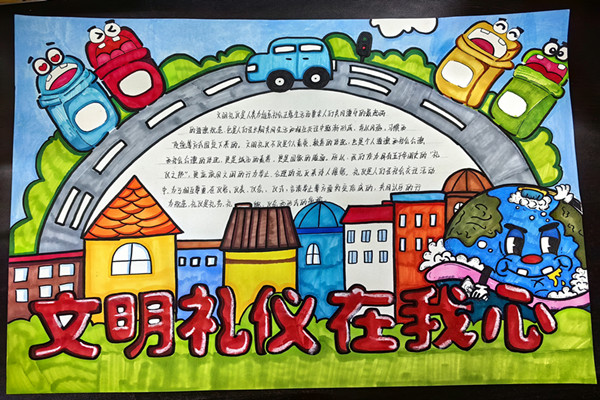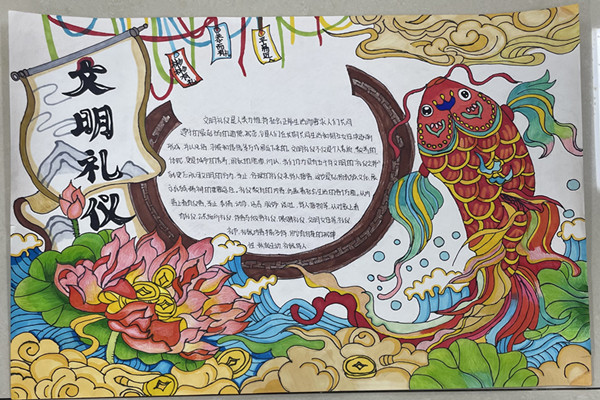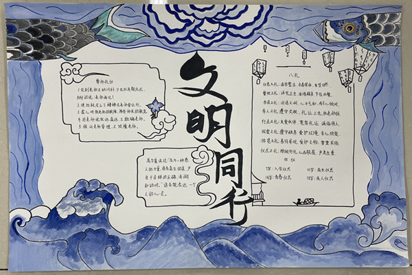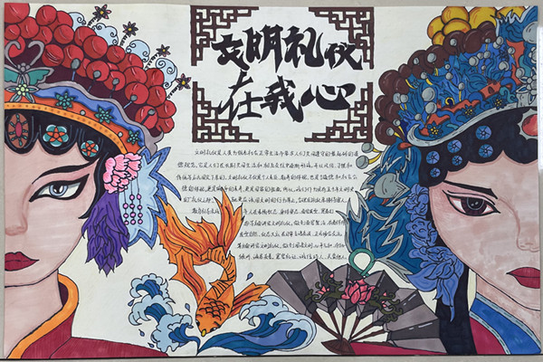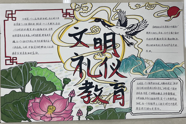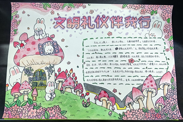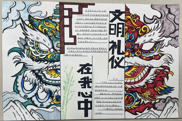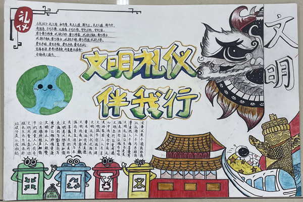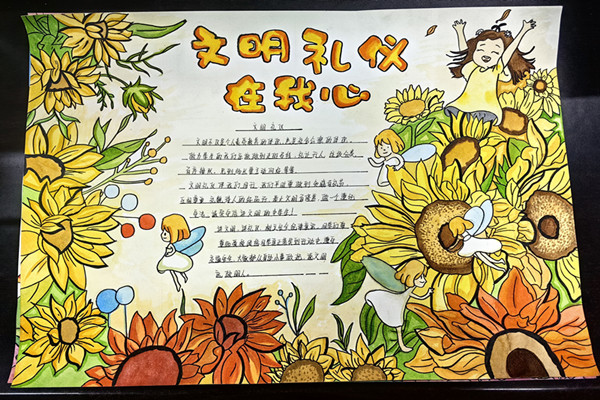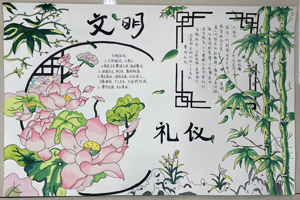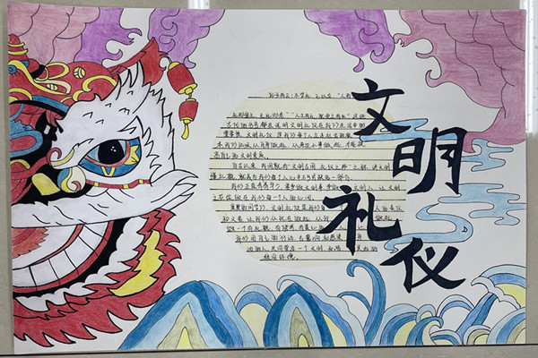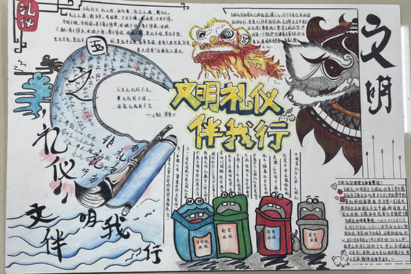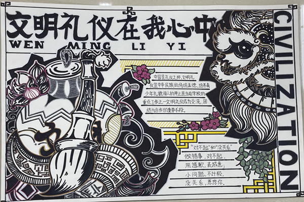 此次活动得到了各班级学生的积极响应,共征得作品50余幅。参赛同学紧紧围绕主题精心策划,把自己对文明礼仪的理解付诸于笔端,描绘于画纸之上。她们用优美的文字、生动的图画、鲜明突出的主题、独特新颖的版面设计、恰到好处的色彩,形象地诠释了“文明礼仪”的意义和“文明礼仪伴我行”的具体行动。