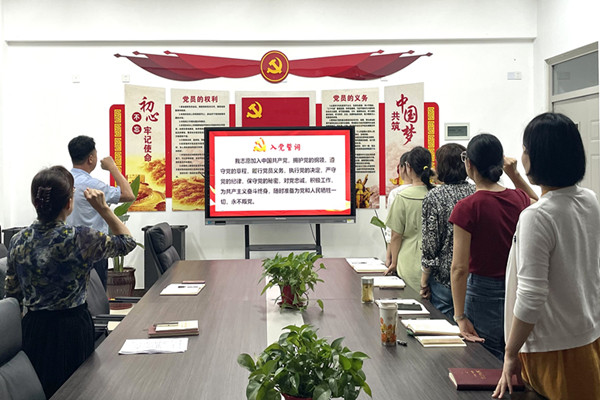 重温入党誓词,重忆入党初心。全体党员面对党旗,重温誓言,铿然在耳,坚定入党信念,积极践行入党誓词。