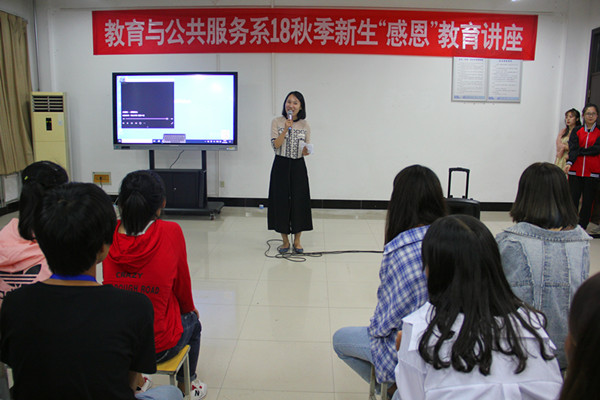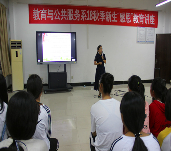 “感谢父母,赐予我生命,不求回报地爱着我疼着我;感谢老师,传授我知识,告诉我做人的道理;感谢朋友……”,2018年9月9日,教育与公共服务系组织了本系18级秋季新生感恩教育。本次感恩教育主要包括“感恩父母”主题讲座、感恩歌曲吟唱和微信诉感恩三项内容。