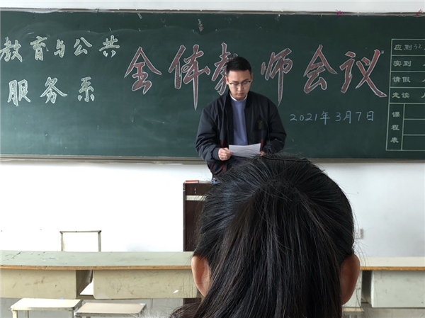 春回大地、万物复苏,沐浴着和煦的春风,我们又回到熟悉的校园。新学期、新征程、新挑战,为了谋划系部发展,确保系部工作平稳有序进行,3月7日上午,教育与公共服务系召开了系部全体教师会议。