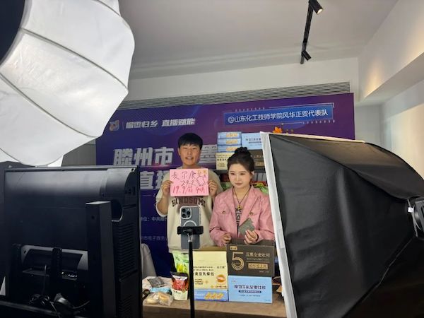 在指导老师的带领下,我系参赛团队经过为期18天的紧张有序的赛前培训、直播演练等精心筹备,于3月30日参加滕州市“墨子科创杯”直播电商创业大赛初赛。比赛现场共搭建23个独立直播间,参赛选手在同场景、同时段、同时开播,通过直播间为网友推荐滕州本地特色农产品。在两个小时的直播比赛中,经贸系风华正贸代表队的选手们通过抖音平台进行现场直播带货,亮出自己的直播“法宝”,展示了直播技巧、话术能力和团队合作精神,也展现出在电商领域的创新思维和创业实力。