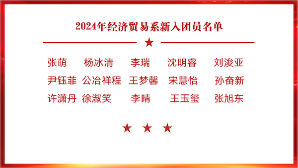 在庄严的国歌声中,入团仪式正式拉开帷幕。经济贸易系团总支书记高瑞先首先宣读了本次新入团团员名单,向新团员表示热烈的祝贺,并希望他们能够牢记这一光荣时刻,牢记团员的职责和使命,不断提高自己的思想政治素质和实践能力,为实现中华民族伟大复兴的中国梦贡献青春力量。