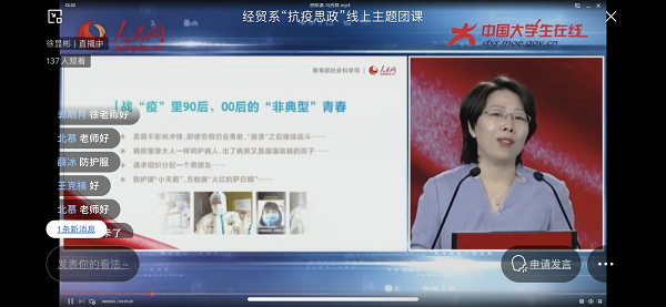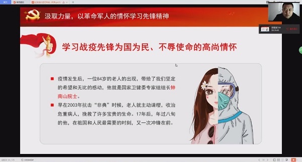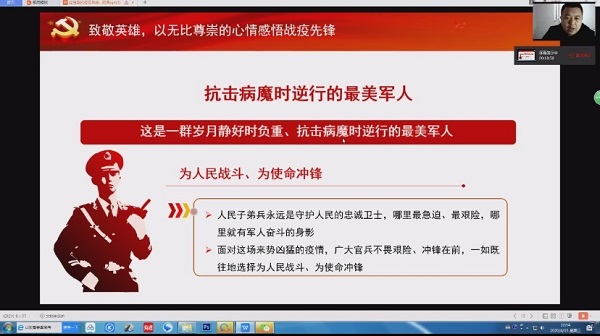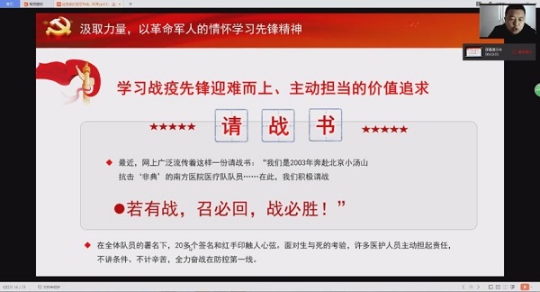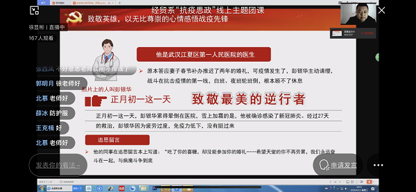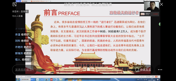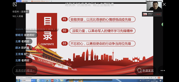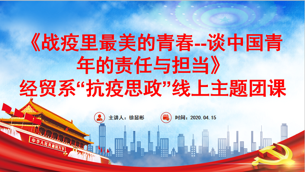 4月15日经济贸易系团总支开展了“抗疫思政”线上主题团课活动,通过线上抗疫思政主题团课课件讲解、抗疫思政主题视频《战疫里的最美青春--谈中国青年的责任与担当》的观看学习,对系部共青团员进行思想引导,将疫情提出的全方位议题,转化为爱国主义教育的生动素材。