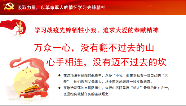 面对疫情凶猛的态势,在以习近平同志为核心的党中央的坚强领导下,亿万人民团结一心,一道抗击疫情的钢铁长城迅速构筑起来。在这场没有硝烟的战场中,党中央把人民群众生命安全和身体健康放在第一位,对加强疫情防控做出了全面的部署,为打赢疫情防控狙击战提供了根本政治保障;战斗在一线的广大医务工作者、科研工作者、人民解放军成为“最美逆行者”;社会各方纷纷慷慨解囊,涓涓细流汇聚成大爱;一座座“火神山”医院以奇迹般的速度拔地而起,展现了中国速度和效率;在大灾面前,中华民族再次展现出强大的凝聚力,向世界诠释了中国精神,展现了制度优势,这些都需要青年学生继承和发扬。