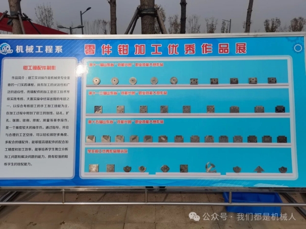 以技能为翼,以奋斗为笔!近期,机械工程系承办的山东省特种作业大比武高处(吊篮清洗)作业、第十五届山东省化工行业职业技能竞赛机械钳工赛项取得圆满成功,比赛过程中涌现出一批优秀作品和获奖选手。为进一步展现办赛成果,融合一体化教学工作,服务技能人才培育,在广大学生中营造良好的技能成才氛围,机械工程系于12月3日在机械楼东广场举办大赛成果展。