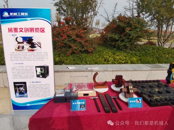 机械工程系依托专业建设和地区班墨文化,开展班墨文创活动,此区域是班墨文创展区。有依托化工检修专业的钳工镶配件,3D打印作品、利用红木材料结合数控加工工艺所作做的鲁班锁和象棋,在课程体系和教学过程中融入“班墨”匠心文化,将工匠精神扎根心中,把专业教学与匠心传承有机统一起来。