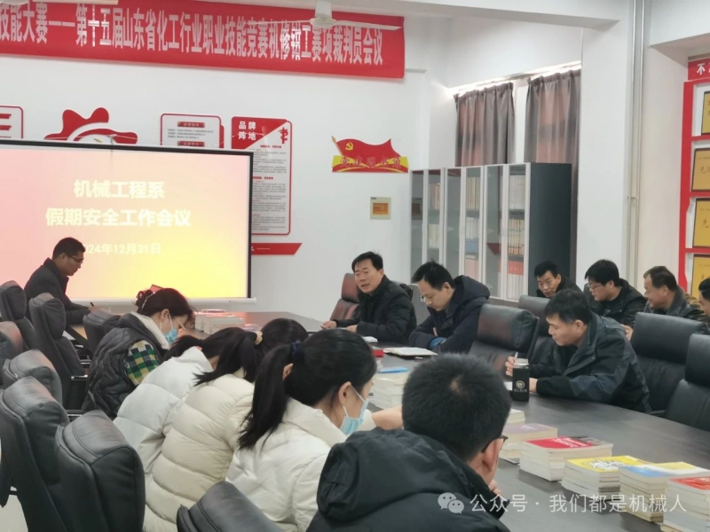 12月31日,机械工程系在215会议室召开2024工作总结和2025年寒假假前及假期安全工作部署会。会议由机械工程系马洪光副主任主持,孔磊磊主任及全体班主任和实训室管理员参加会议。