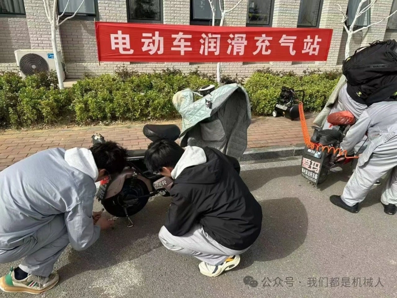 针对门窗异响问题,社团成员们对合页铰链进行专业润滑;周五放学时段,在车棚处设置非机动车充气润滑服务,为师生自行车、电动车免费充气并润滑,方便校园出行;宿舍楼大厅设置服务站,提供基础应急处置物品,及时响应学生服务诉求。