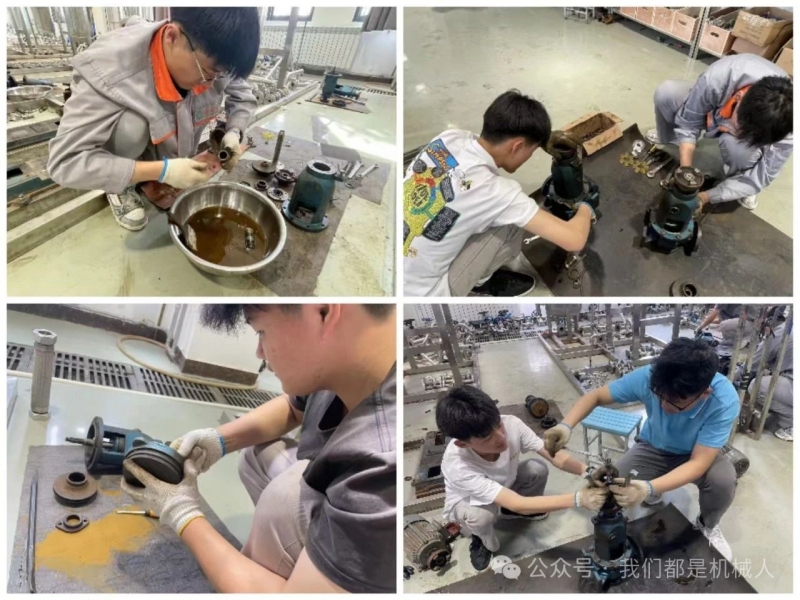 技能活动月期间,因化工管拆实训室升级改造,需要对室内16套泵装置存在的叶轮锈蚀、轴承卡死、密封失效等故障全面检修,要求四月中旬前完成。接到任务后,社团九名同学主动请缨,连续五天驻扎现场,拆解泵体、排查故障、清洗零部件、更换填料、校准轴系同心度等,恢复设备性能。尤其在调试阶段,同学们熟练应用离心泵百分表找正法,最终使水泵流量和扬程稳定达到运行标准。
