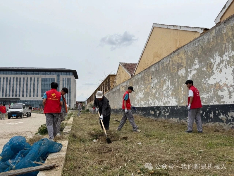 在党员教师的感召下,团员学生们热情高涨,迅速投入战斗。他们三五成群,默契配合:有的仔细清扫路面杂草和纸屑,让道路恢复整洁;有的深入花坛草坪,细心捡拾隐藏的塑料瓶、包装袋等白色垃圾;有的合力清理堆积在角落的建筑垃圾,消除安全隐患。同学们此刻紧握扫帚、铁锹、锄头,在与杂物、尘土、废弃物的“较量”中展现别样风采。一位学生擦着汗,脸上却洋溢着自豪的笑容,“当看到自己清理过的区域变得干净清爽,这份辛苦特别值得!”劳动的过程,成了职业素养培育和服务意识塑造的生动课堂。