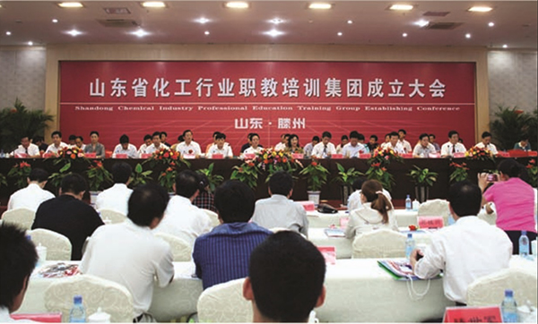 “关于组建山东省化工行业职业教育培训集团的请示”,省厅给予批复。经过二个多月的筹备,2007年9月23日上午在滕州宾馆召开 “山东省化工行业职业教育培训集团”成立大会,同时举办“首届化工职教集团校企合作论坛”。中华人民共和国劳动和社会保障部培训就业司冯政处长、山东省劳动和社会保障厅张凤光副厅长、山东省劳动和社会保障厅培训就业处房明处长、山东省石油化学工业办公室刘言主任、枣庄市人民政府副市长吴承鉴、枣庄市委常委、滕州市委书记王忠林、枣庄市劳动和社会保障局局长赵悦斌等领导,35家大型企业、15家职业学校代表出席集团成立大会,大会选举产生了集团理事会理事长、常务副理事长、副理事长、常务理事、理事。