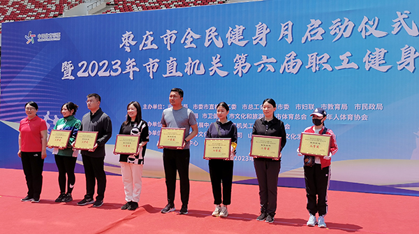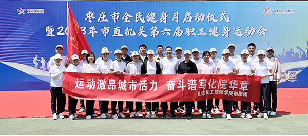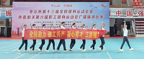 强工兴产 凝心育人 工匠摇篮”的口号响彻整个场馆,展示出我院青年教工昂扬向上、飒爽自信的良好精神风貌。我院参赛队在比赛中荣获三等奖,并参加了枣庄市全民健身月启动仪式展演活动。