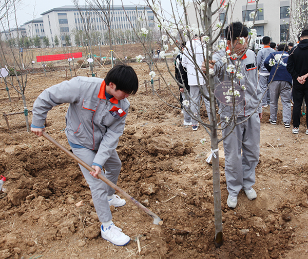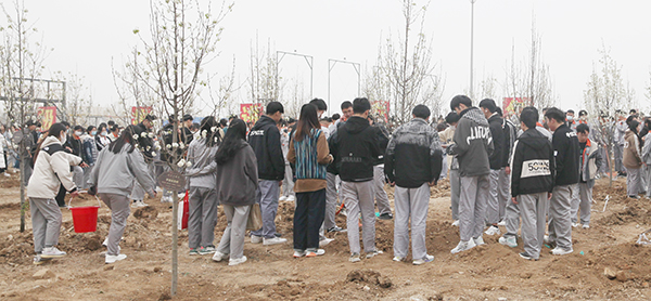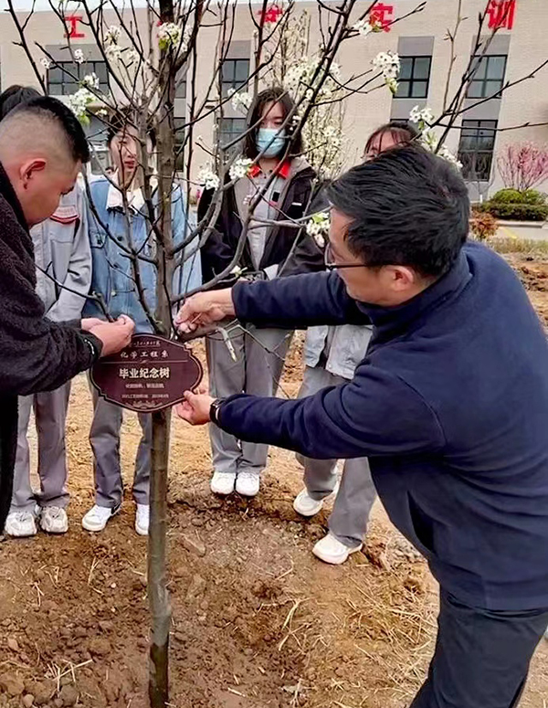 现场,老师和同学们一起挥锹铲土、扶直苗木、回填细壤、夯实土层、提水浇灌……大家饱含感恩之情亲手栽下一棵棵彩叶豆梨。并把带有班级名称和寄语的树牌挂在枝头,用这种独特的毕业纪念方式,向美好未来喝彩。