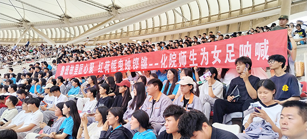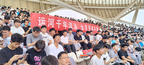 6 月 21 日下午, 2025 赛季中国足球女子超级联赛在枣庄文体中心体育场激烈上演。学院1000余名师生现场观赛,为女足姑娘们加油助阵。