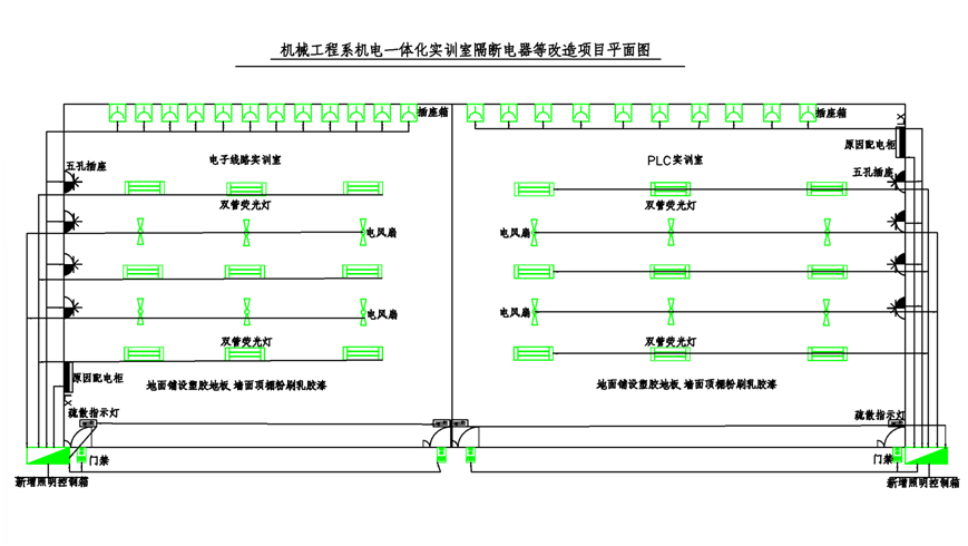 工业机器人实训室南区多个班级同时上课,存在相互干扰、影响教学效果的问题,且该实训室常作为学生晚自习教室使用。为优化教学环境,提升教学质量,拟将工业机器人实训室南区改造为PLC实训室和电子线路实训室两个独立空间。本次改造核心目标为实现两实训室物理隔离,满足各自教学功能需求,保障教学安全与环境舒适度。