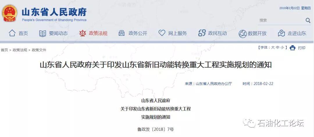 2018年2月22日,山东省人民政府办公厅发布了“山东省人民政府关于印发山东省新旧动能转换重大工程实施规划的通知”。
