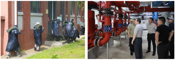 根据《山东化工技师学院防汛应急演练方案》,学院组织开展防汛应急处置演练活动。演练模拟汛期持续强降雨情况下,学院泵房进水,造成设备停运、机组停机预警,出现险情后,各部位密切联动,工作人员迅速高效运送沙袋至进水口,垒起围堰,清理积水,快速消除险情。演练结束后,参加演练的各位领导对泵房设备进行了巡检。