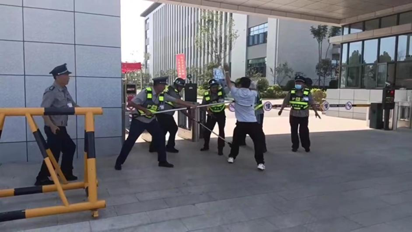 演练模拟两名“歹徒”携带凶器准备强行闯入学院,一名保安发出警报,同时按下一键报警按钮,应急指挥组长立即协调指挥,并上报学院有关领导;值班保安手持钢叉、盾牌、抓捕器、警棍等器械制服两名“歹徒”;民警接到报警赶到现场,将歹徒抓捕,警报解除。