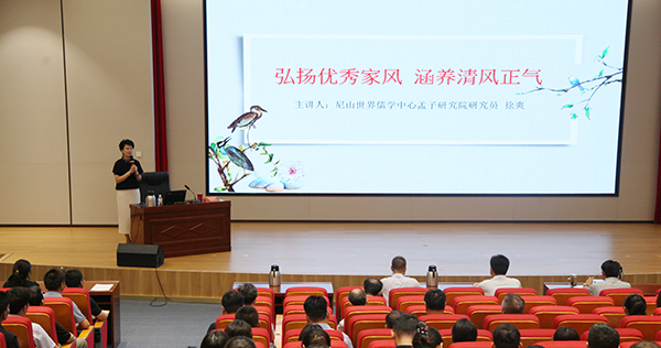 为深入贯彻落实习近平总书记关于注重家庭家教家风建设的重要论述,进一步加强党风廉政建设,大力推进廉洁家风意识在家庭落地生根,营造清廉家风的良好氛围。9月16日下午,学院特邀尼山世界儒学中心孟子研究院研究员、中央社会主义学院特聘教授、政德教育讲师徐爽教授在高铁新区校区报告厅作《弘扬优秀家风