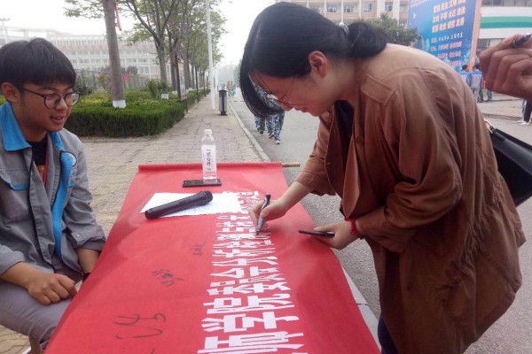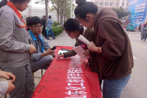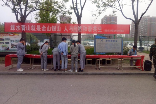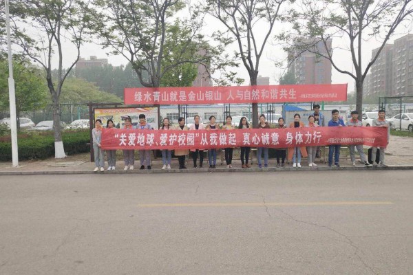 活动二:“签名活动” 由韩梅老师、贾焕美老师带领,系团员自愿组成志愿者,在篮球场东面举行,现场热闹非凡。杨主任指出,此次活动目的是让更多的人了解世界地球日,竖立爱护地球、保护家园的意识。伴着“世界地球日”的““关爱地球、爱护校园”从我做起,真心诚意,身体力行”宣传语,和《地球日之歌》、《唯一你爱的世界》、《End of the World》和《Like A River Around A Rock》歌曲,吸引了过往的老师及学生的注意力。大家都很好奇这是什么活动,纷纷驻足,上前观看。志愿者们积极向他们介绍此次活动的主题,并引导大家签名留念。活动快结束的时候,我系大部分教师集体与签满名字的横幅合影留念,以此为这次活动的结尾。