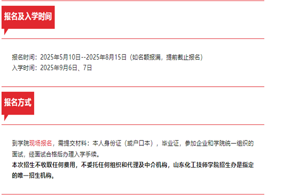 学员须按照招生简章要求进行预报名,根据公司要求参加面试,面试通过后初中起点在校学习4年、高中起点在校学习2年、大专及以上起点在校学习1年,培训结束后签订三方协议下厂实习,学制期满经济南圣泉集团股份有限公司考核合格签订劳动合同。